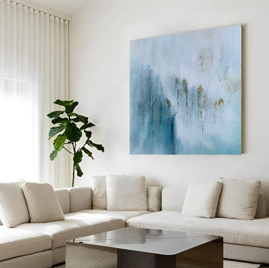Cerulean - Grande peinture moderne blanche et bleu clair sur toile